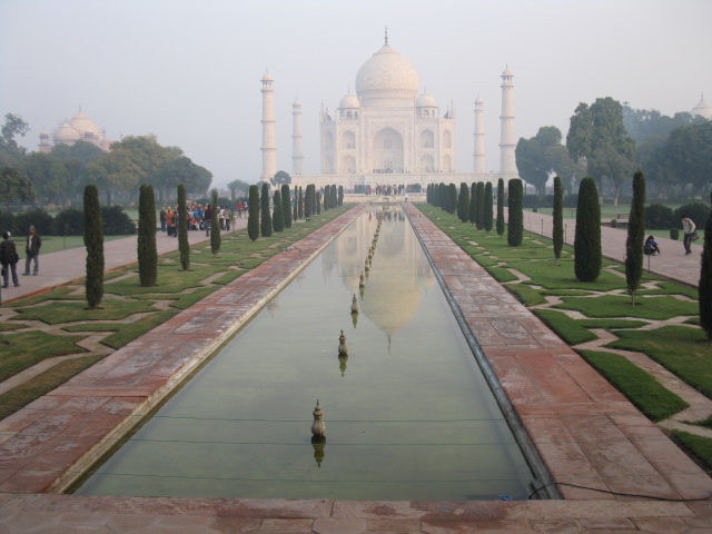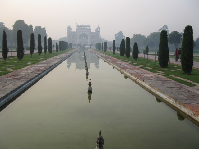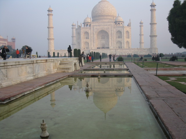 up side down Tajimahal on surface of water. 門からタージマハルまで1kmも無いが霞が掛かってる。 水面に逆さに移るのが対照的。 |