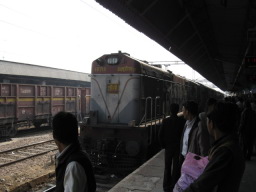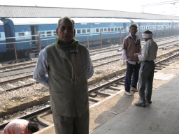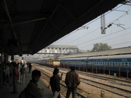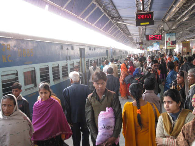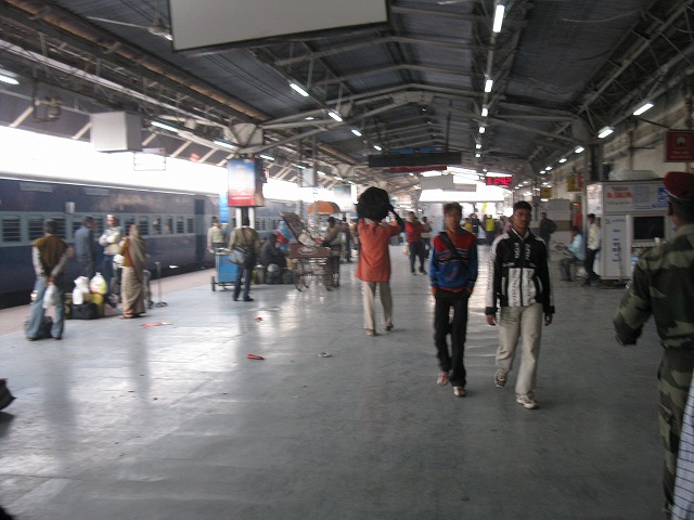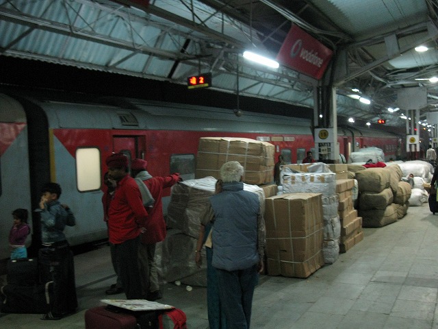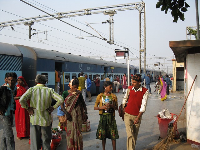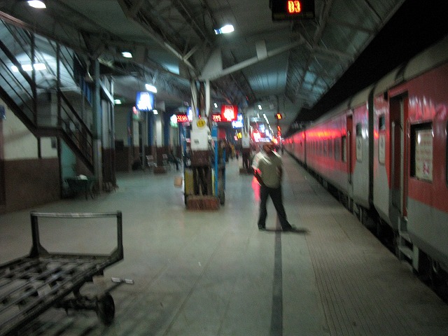 In Japan most of train direction is same if same platform, many train arrive and depart in one platform here but many times different direction of departure here. Rajidani express carry more than 20 car, arrive 18:38 at Mathura station, this type of train can not pass between car while running. if I get on wrong car I can not take meal because meal provide soon after start Mathura station. Just arrive my train I find one of navy uniform solder , I try to talk him , he will back from his home and he know right direction of my train, he had reservation in same train, then I try to go right place to my car and arrived just on time when train arrived,. 列車の来る方向は日本では一つのホームでは大体は決まってるが、ここでは1時間に何本も来る列車は、いずれも進行方向が違う。 ラジダニエキスプレスは20両以上連結しているので私の指定車両の位置が列車の進行方向によってホームで待つ場所が随分違う。 到着直前に海軍の制服を来た同じ列車に乗ると言う若者に話した、里帰りから戻る途中で指定席の切符を持っていて正しい列車方向を知っていた。 方向が判って検討をつけて走ったら列車が来て止まる時に指定車両の場所に間に合った。混んだホームでは荷物を持って大変な思い。 そんな苦労をして不安な中ですっかり暗くなった18時38分MATHURA駅発のラジダニエキスプレスに乗りました。列車の停車時間は数分だった。 |