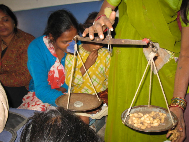 again, more than half of passenger can not understand English, I ordered peanuts she wrapped one order by used newspaper, I wondering 50rupie or 20rupie paper money, one of boy sitting cargo rack telling me "5rupie"\10us$0 .1-, taste good nice smell well roasted crispy peanuts. 更にピーナッツ売りが来る、石ころを乗せて落花生の重さを量り売っているが乗客でとんでもなく混んでいるのです。 価格が判らなかったので50ルピー札か20ルピー札にしようか迷ってると上の荷物棚の若者が5ルピー=10円と言ってくれた。 10cm四方の新聞紙に包んで渡してくれるが殻は床に捨てる。 こんなに混んでいても商売してる、頭が下がります。 石を乗せて落花生を追加して5ルピーで写真の3倍程の量を包んでくれる ローストしてあって中身は小さいが香ばしく美味しかった。 私の周りの人にも食べるように誘って皆でわいわい言いながら食べた。 先ほどから話している老人以外はここでも英語が半分も通じない人が殆ど、だが手振りを交えて話すとかなり理解できる、旅の醍醐味だ。すると若者も分けの判らない英語で何か言おうとしてくれるが「ワカラナイ〜、もう一度アゲイン」やはり判らない |