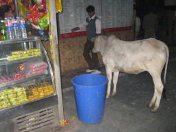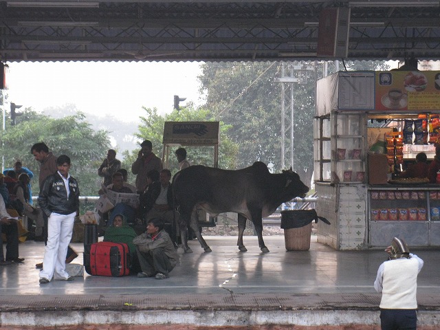 here. ヒンドゥ教では牛は神聖な動物、犬が繋がれてるようにホームに牛が繋がれてます。 もちろんホームの上に糞も尿もします。 |