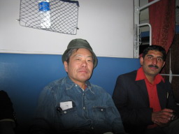 meal service. 私の横は口数の少ない若者。 もう一人だけ写真を撮るのを嫌がったモスリム老人が居た。 これはビジネスマンが写真を撮ってくれた。 頭の上のミネラルウォーターは食事と一緒に支給された私のもの。 |