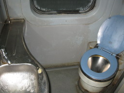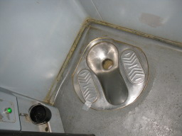 black cup will get water to wash after toilet. put black cup pour water automatically if no water in black cup, I wounded what people will do if shake train while use toilet woman, there is no hand hold around this room. 夜中のトイレ、和式と同じだが紙は無い。ひょうたんの形の部分が凹んでいる。 男はおしっこを先にしてから大を?。 女は壁に向かっておしっこをしてから180度向きを変えるのか? 緑のランプはタンクに水がある表示らしい、水は左下の黒いカップを載せてカップに水が無い時のみ自動的に注がれる。私は用を済ませた後、右手で尻を洗うことに。黒いカップは下が丸いので下に置くと転がる。 黒いカップを何度も洗ってから使った。列車が揺れている時は持つ所がないので辛い。トイレはいつも考えさせられる場所だ。 |
