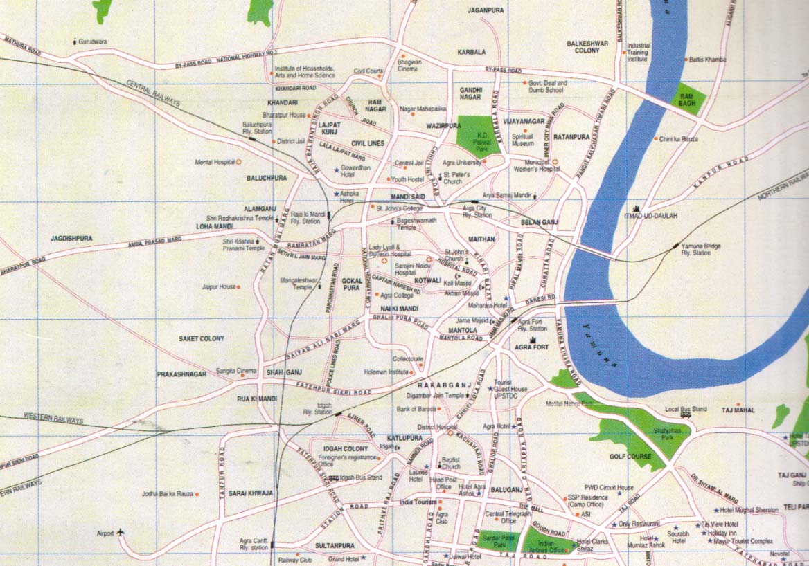 take train from Agra cant station map below. 午後に列車に乗るのは下の鉄道が合流したところにあるAgra Canttアグラカント駅、タージマハルは川の曲がった外側、地図右下のTAJIMAHAL