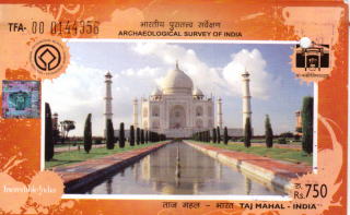 on decenber entrance fee 750rupee for foreigner.. ホテルゴーパルはタージマハルに近くて歩いて5分も掛からないで入口に行ける、構内は広くて野生のサルも居るタージマハル。 12月は入り口は朝7時から開いていたが 夏は暑いから朝早くからオープンしているのだろうか 外国人は750ルピー=¥1500-の入場券 |