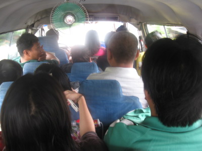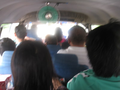 car is Mazda Bongo, they change increase passenger capacity, 5 seat, usually 3for each seat but sitting 4 passenger, addition over engine people sitting reverse side. totally more than 20 people. 車はマツダボンゴ、3人掛けのシートを5列にして更に3人掛けに4人座らせるのと、エンジンの膨らんだところには逆向けに座って20人を超える乗客です。 |