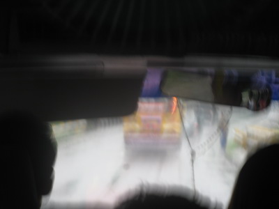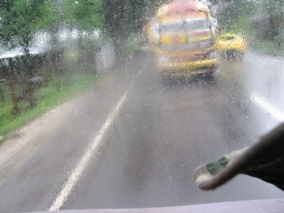 car want pass this car from back. がんばって車は飛ばすがさすがに乗客が20人を越えると加速が悪く、でかいバスが追い越そうと虎視眈々と追い越しの隙を狙う後ろのバス。 手前に見えるのは私の帽子のひさし。 |