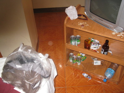 dried by air conditioner. 島伝いにマニラまで行く計画を立てる。 計画通り行くと途中でシャツが不足するのでTシャツを洗濯し乾かしている所。 Tシャツの下にミネラルウォータがエアコンの冷気で冷やしてあるのが見える。 |