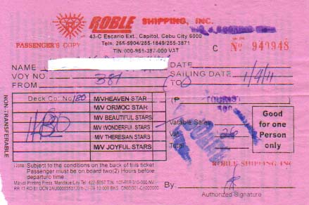 check out time till 6pm additional fee P260- エコノミーはP400-,エアコンの効いたツーリストクラスはP500-、他にビジネスクラス、キャビンクラスや椅子のエコノミーがある。 出港は22時、乗船は19時。 今泊まってる宿は1泊p520-だがチェックアウト時間を18時まで延長して追加P260-を支払う。 |