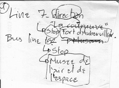 それで宿の受付嬢を呼んで私の表示した航空博物館のページを見せて、「ここへ行く方法を書いた所を探しているがフランス語が読めないので行き方を紙に書き出してくれないか」と頼んだ。朝2時頃の事だ。 I find aviation museum in Paris in internet at hostel in midnight to find destination next day, its indicated only France, I can not read how to go there, I asked staff of hostel, and write it way to museum in english. |