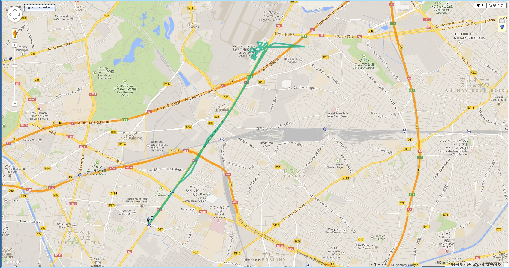 地下鉄を降りてからバスで航空博物館を往復する間の軌跡 Green line is GPS trace after get off metro, take bus way to museum