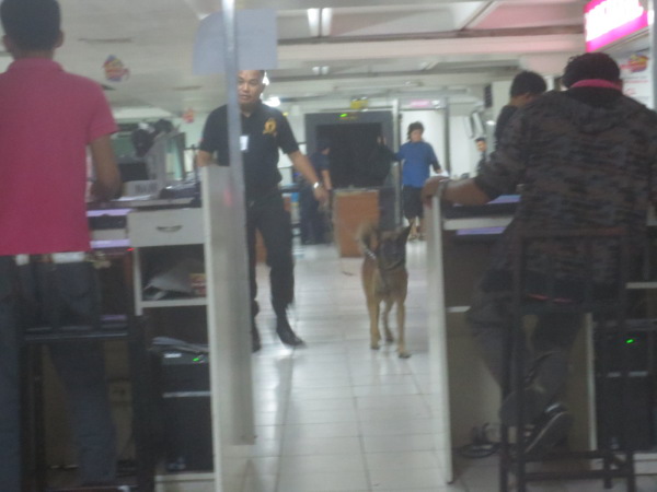 向こう側の入り口から入ってピンクのシャツの係員がチケットチェックインカウンター、カメラでの写真撮影とバーコードによるチェックイン、その前には犬がX線検査の後で再度荷物ニオイ検査。 Entering through the entrance on the other side, a staff member in a pink shirt will be at the ticket check-in counter, where you will be photographed with a camera and checked in with a barcode. Before that, a dog will X-ray your luggage and then sniff it again. |