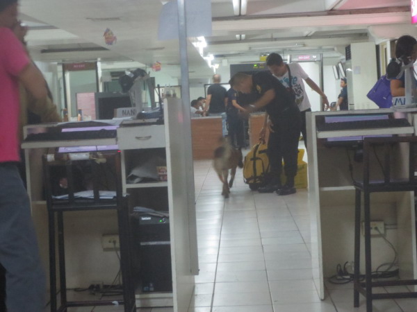 私の荷物も犬がクンクンと嗅いで無事通過。 The dog sniffed my luggage and it passed through safely. |