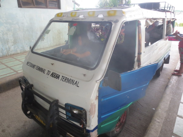 カガヤンデオロのブルワバスターミナルまで戻ってきました。これから町の中心部に近いアゴラバスターミナルまで乗り合いジプニーに乗ろうか迷っている私。 スリに遭った経験を思い出し、乗り合いジプニーで行ってもその後は再びタクシーに乗ることを考えると最初からタクシーのどちらが徳か分からないのでタクシーに乗ることにした。 結局はタクシーで行った方が総合計はP10\22-高いだけだった。 I returned to Bulwa Bus Terminal in Cagayan de Oro. I was wondering whether to take a shared jeepney to Agora Bus Terminal, which is close to the center of town. Remembering my experience of being pickpocketed, I decided to take a taxi, since I wasn't sure whether taking a shared jeepney would be more economical than taking a taxi afterwards. In the end, taking a taxi was only 10 yen (22 yen) more expensive. |