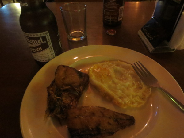 焼き魚のバゴスとビールの夕飯。 Dinner of grilled fish bagos and beer. |