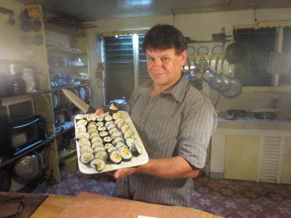 私が巻き寿司の作り方を教えて、彼も巻いてみた彼にとっては始めて作る日本料理だ。 彼は真ん中の具を沢山入れすぎて結局はみ出して外に出て中に巻けなかったので具が真ん中にならないし形がイビツ。初めてのお気に入りの巻き寿司にご満悦。 I taught him how to make sushi rolls and he tried rolling one too, it was his first time making Japanese food. He put too much ingredients in the middle, so it ended up spilling out and he couldn't roll it up inside, so the ingredients weren't in the middle and the shape was odd. He was very happy with his first and favorite sushi roll. |