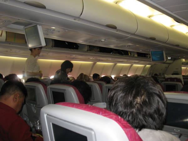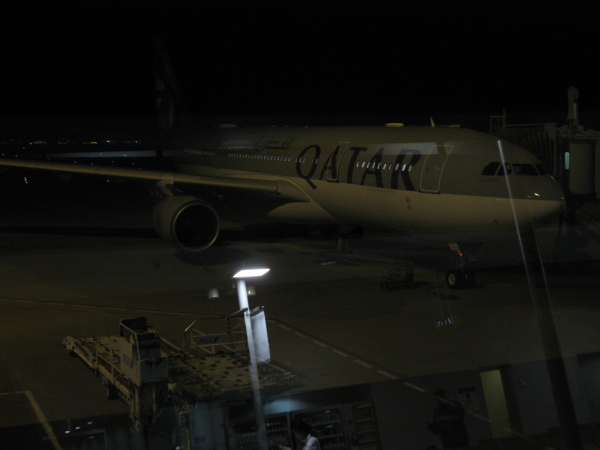 | 飛行機は2-4-2列のA330、ドーハまで11時間15分の飛行とアナウンス 離陸23:22、この食事が出てくる頃には日が変わる。 私は和食を選択、飲み物はビールにワインに水、無料のものは何でもいただく貧乏人根性が抜けない。お腹はお替りをお願いするほども空いてなかったのにね。 関西空港離陸して1時間ほどしたら見ていた映画の画面が動かない、客室乗務員に言ったらリセットしてくると、見るとどの席の画面も同じように停止していた。 電源投入時の画面はパソコンと同じ、リブート画面を読んでいるとリナックスだRedhotとか表示して色々と読み込んで暫くしてやはりエラーで停止、これでは地図の表示も何も出来ない万事急須で寝る。機内アナウンスで謝っていたがパソコンだからと私の出る番でもない。 |