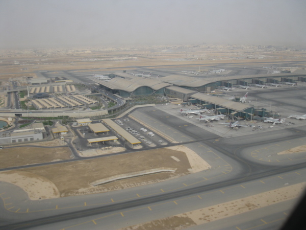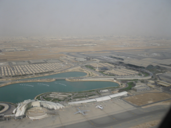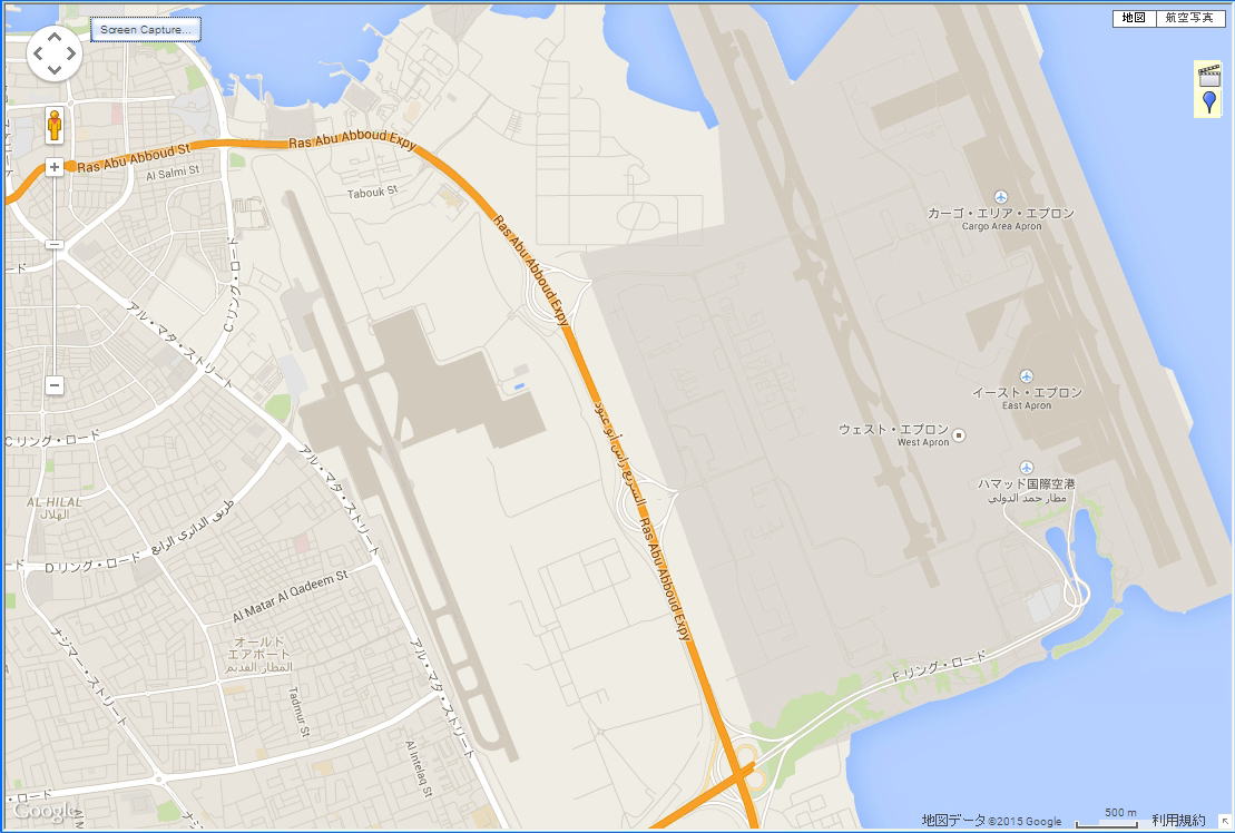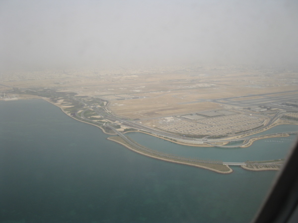 | ドーハの町は写真のずっと右側。古い空港も右方向、テニスラケットのフレームのような空港アクセス道路、フレームの先端部分が空港入り口、ってことはこの写真の右端あたりが空港内のABCDEと書いてあった中心部分か。建物向こう側の新しい滑走路も黒く細長く見える The town of Doha is on the far right of the picture. The old airport is also in the right direction, an airport access road such as a tennis racket frame, the tip of the frame at the airport entrance, and so on the right side of this picture is the center of ABCDE in the airport. The new runway across the building also looks black and slender |