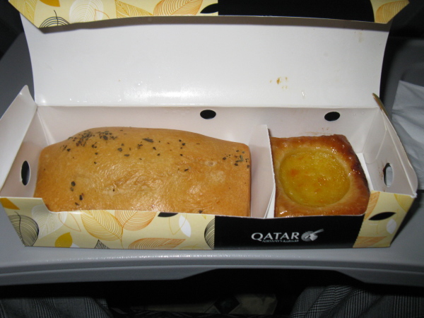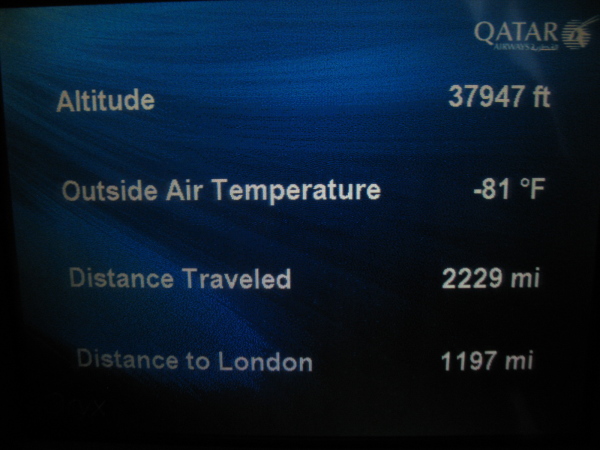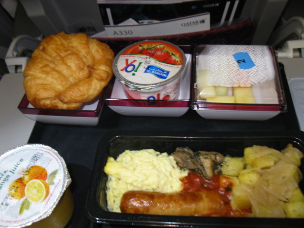 | 私は真ん中の4座席使ってゴロッと横になって寝ていたが暇なので窓側にいた同年齢の男性と話をした。 夫婦でクロアチアとスロベニアに行くと、この時期はまだ冬の価格なので9日間でホテルも現地の見学やその他の手配も含んで一人18万9千円、名古屋から関西空港までの新幹線代も含んでいると、現地での移動はすべてバスになっていて荷物を運ぶ必要がないので楽と言っていた。なるほど。 私がロンドンに行くと言ったら「イギリスはロンドンから北の方に列車で行ったが良い所ばかりだ」と、私はロンドンの旅行書を持ってきたがイギリスの他の地域の旅行書を持って来なかったのを悔やんだ。 着陸一時間前に出てくる食事をゆっくりいただく。日本時間の朝9時過ぎドーハ時間朝3時過ぎ。 |