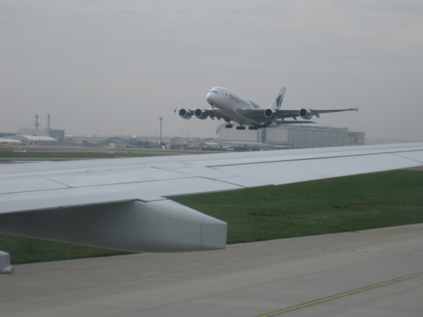 | ヒースローには12:10着陸、滑走路が沢山あるので離陸便滑走路を横断するのに離陸するマレーシア航空エアバスA380を待ちます。 ロンドンは日本より8時間遅れ、ここでアナログ腕時計の針を日本を出てからそのままだった針を日本時間より4時間進めます。ディジタル時計では24時間で示しているので設定が邪魔くさい、更に日も確認しながらの設定になるから旅先では時間の変更が楽な針のあるアナログ時計が良い。 |