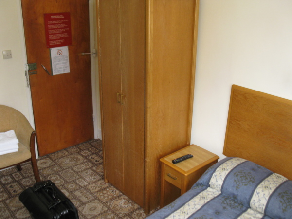| CaswellHotelはカード払い45ポンド¥8340-の宿、トイレとシャワーは共同だが最上階で誰も通過しないしトイレは直ぐ横のドアなので時々はパンティのままでトイレに出入り。 この木製キャビネットは洋服ダンスだが中には電子ロック式の宿泊者用の金庫が取り付けてあった。 この宿はbooking.comでも予約できるが安い方法はメールをと、lpndon@hotellondon.co.ukと言ってくれた。メルアドにcaswellの文字はどこにもないがオーナーは似た物件を複数持って、価格はその日毎に変化する、特に金曜と土曜は高いのだ金曜だったので45ポンド土曜は70になった。 オーナーはbooking.comを見て近隣のホテルの価格をチェックし、その中の最安値をつけて客を呼び込もうとしているとアルバイト係員は話していた。 address 住所:25Gloucester Street ,London SWIV2DB Tel: 020-7834-6345頭の020がロンドンの市外局番 020 is area code of London |