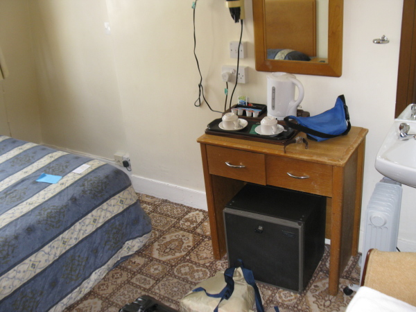 | 洗面台に冷蔵庫もコーヒー紅茶もポットも完備、もちろん多チャンネルTVもドライヤもある。ベッドはダブルベッド。洗面台の下に電熱暖房はあるが冷房はない。 Caswell Hotel There is a refrigerator, coffee, tea and coffee in the wash basin, and of course there are multi-channel TVs and dryers. Bed is a double bed. There is electric heating under the wash basin but there is no cooling. |
