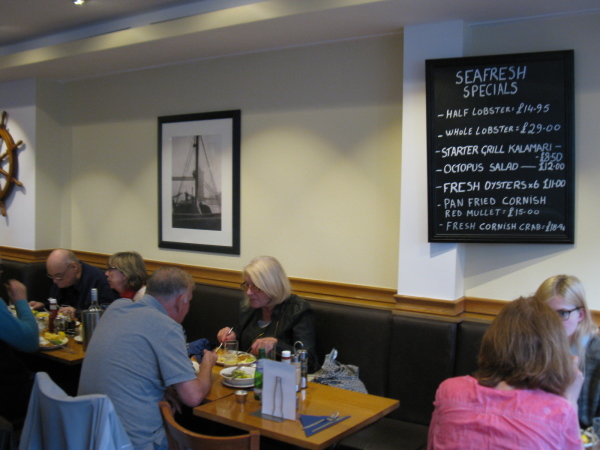 | ドアを入った所で女性がサーモンをおいしそうに食べていたので注文することに。 車は道路両側とも同じ方向で駐車しているが道路は一方通行ではない、日本では考えられないがあちこちで逆向け駐車を見かける。走行している車は日本と同じ左側通行なのだが左右を気にせず駐車する感覚は私には理解できない。 |