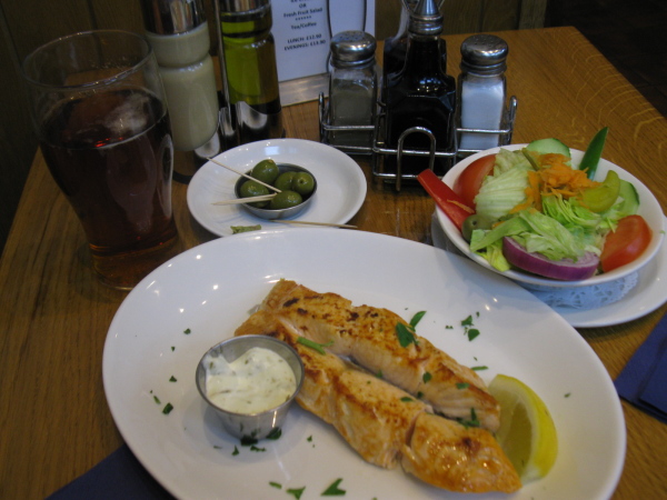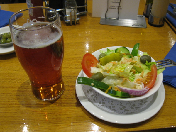| 先にサラダが来た、日本円で言われると分かるのだがポンドで書いてあると価格の高いのが実感しない、計算してびっくり、 Served beer and salad first, I did not realized when writing in English pound on a bill I can realize value if write in Japanese yen, I surprised. |