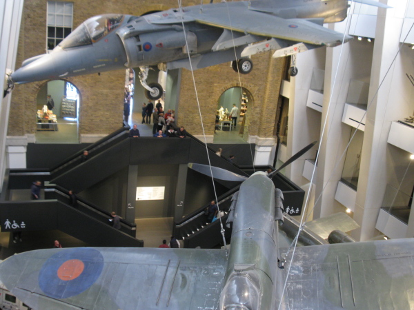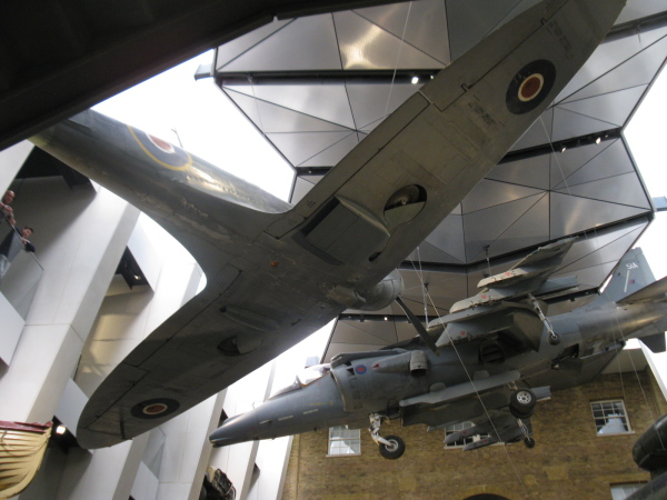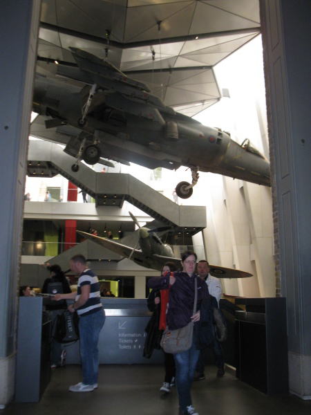 戦争博物館の玄関を入ると直ぐに大きな戦闘機ハリアーが吊ってある。無料だからお金を払うところは無いが寄付を募っていて寄付の受付がある。 Entrance inside of the war museum, a large fighter Harrier is hanging. There is no place to pay because it is free, but they are asking for donations. |