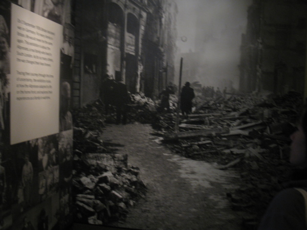 | 左から来て、右手に目的の建物はある。見えてる赤いバスの所で道を曲がってきた。写真左手端に小さく写ってる老婦人、戦争博物館の入り口は奥か手前の表側かどちらにあるかと尋ねたら either アイザーと返事してくれて直ぐにピンと来なかった私にbothと言い直してくれた。日本ではイーザーと発音だったと私も気付いたが。 | |