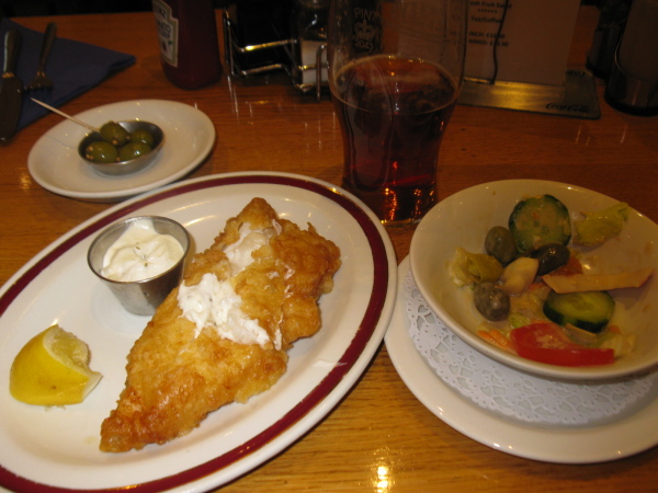 | フィッシュフライを頼んだら鱈のフライ、この日は現金で支払いチップを含め25ポンド近く払う。両替したレート¥208なら¥5200-の夕食、高い。 I ordered fish fry, this is cod fish fly, I paid on cash today, almost 25 pound include tips. exchange rate \208- then todays dinner are \5200us$45- its expensive. |