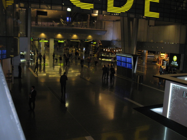 | 予定通りドーハ到着04:34外気温25℃、空港は新しいが日本からの便はバスでターミナルビルに運ばれる、バスで運ばれる場合はビルに入って直ぐにX線荷物検査がある。ここまでは今までと全く同じだがターミナルビルは新しい。 右側の荷物検査を終えて出てきましたここは3階、直ぐ左にエスカレータがあるので下に降りる。 ドーハに入国する人や、次の便まで6時間以上ある人は荷物検査の手前にトランスファーカウンタがあり希望すれば乗り換えチケットを持っていても入国を案内してくれる。無料のドーハ市内ツアーがあったりするのだ。 関西空港を出るときに搭乗券を黄色や青の搭乗券入れに入れてくれるので入国の青色を持っていたら係員が「あなたはこちら」と声を掛けてくれる。 乗り換え便の客は黄色いのを持っているので必然的にここに来る、他のところに行こうとしたら係員が声を掛けてくる |