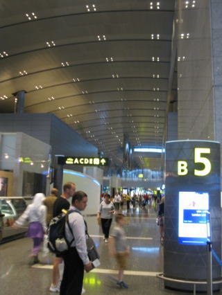 | この写真を撮っている私の背後にCDEと書いてある。ドーハの町から飛行機に乗る人は出国してAとBの間の見えているエスカレータからここに合流する。 Indicate CDE behind me taking this picture. Those who come from the town of Doha merge here by the escalator between A and B. |