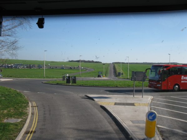 | ここで構内専用のミニバスに乗り換えます、ストーンヘンジまで歩くと数キロある、あの林の向こう側 Changed small one area bus, few kiro meter to stonehenge other side of forest ahead. |