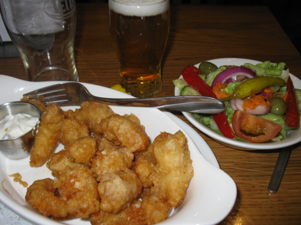 | 店のオヤジにいつもと違う魚を選んでくれと頼んだら「スキャンピはどうだ」と言うので注文した。サラダ3.9ポンド、魚のフライ15.5ポンド、ビールと合わせて21.4ポンド、税を10%2.15ポンド加算して23.55ポンドの食事。現金で払ったから空港の両替レートで¥4898-高い食事だ I asked the shop's chief to give me a different fish, he said, "What's up with a scanpi," so I ordered. A meal £ 3.94 salad, £ 15.5 fry fish, £ 21.4 combined with beer, £ 10.25 plus 10% of tax. Because I paid in cash, it is \ 4898- expensive meal when calculate airport exchange rate |