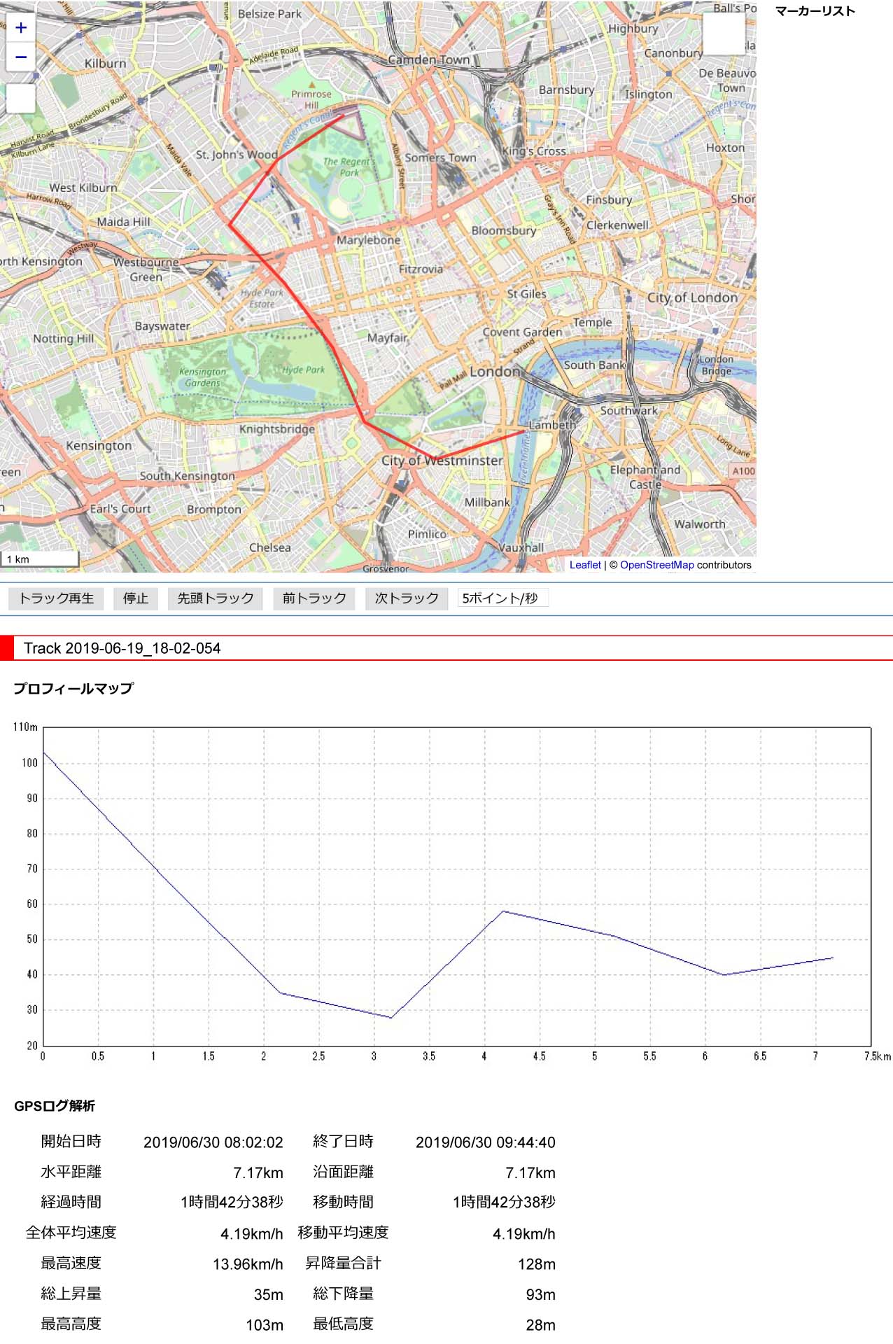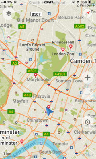 ビッグベンからロンドン動物園までの二階建てパスの軌跡が赤線、こうしてみるとロンドンの町は地下鉄や地上の鉄道が発達してるのが判る
