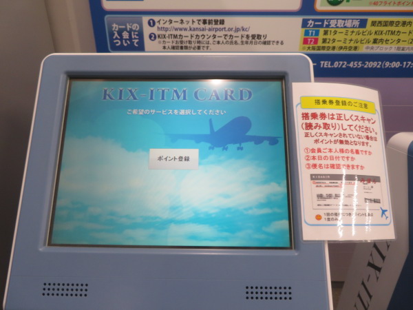 無料で即時発行のKIXカード で利用履歴を入力、シャトル電車に乗る手前にあるKIXカードポイント登録する器械、KIXカードと搭乗券があればポイントを登録できる、国際線は行くときに登録したら往復分のポイントが自動的につく帰国時に機械がないからだ帰着空港が他の空港であっても。出発時に空港使用料をチケット代に含ませて徴収しているからだ。但しKIXカード発行してくれるのはチェックイン前の第一ターミナル二階国内線エリアで7時〜23時KIXカードオフィス時間。 Airport service card KIX-card(no English page) will issue soon except 23:00 to 07::00 at terminal 1card counter, add point only passenger depart so machine input two point if access here, machine equipped entrance of shuttle train. |