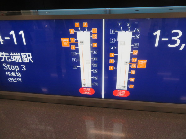 ターミナル北側の搭乗口に行くシャトル電車の案内、えっと私の搭乗口は11だから左の先端駅行きに乗るほうが良いのだが、どちらの電車でも同じくらいの距離。 Shuttle train information , we are here at bottom of red sign, left shuttle reach north end of building, my boarding gate is 11 so get off middle station at right side train,. |