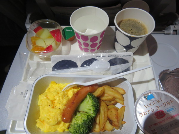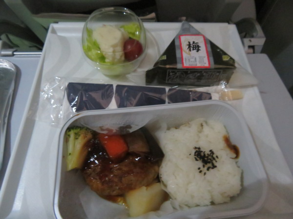 機内食は朝の2時半なので食事は少なめ、おにぎりは途中でおなかが空いた時に取っておく、食事は昨日の朝食以来だ、18時間以上食事をしてない私はお替りをお願いしたら出てきた、この二食目のハンバーグも美味しかった。 Meal service at 2am is small food, triangle rice onigiri is spare for me, I did not have any meal since yesterday morning about 18 hours so I am very hungry, this is second time meal which I asked another meal, Enjoyed delicious hamburg two times. |