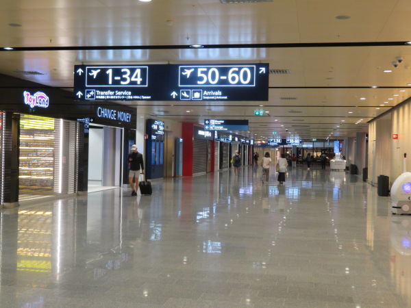Lounge」と小さく見える表示のCHANGE MONEYを左に入る、この時間は閉まっているが赤い柱は熊本ラーメン店。 In the terminal building, passengers are divided into immigrants and transit passengers, and after completing the carry-on baggage inspection for connecting flights, they come out here, but on the right side, on the distant display board under 50-60, "← Premium Lounge" Turn left at CHANGE MONEY, which looks small, and although this time is closed, the red pillar is the Kumamoto ramen noodle shop. |