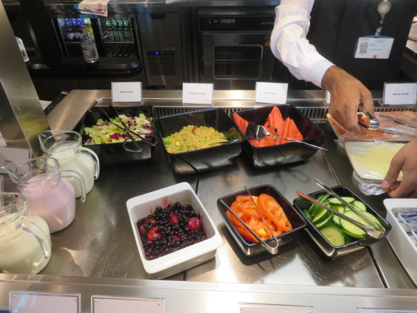 食材カウンター、左端はヨーグルト類、その右のラズベリーとブルーベリーの混ざった甘酸っぱいものにヨーグルトを掛けて食べるとおいしい、その他は野菜類、係員は冷蔵庫から出して並べていた。まだ開店準備中なのだ。 The food counter, the left end is yogurt, the sweet and sour food with raspberries and blueberries on the right is delicious when eaten with yogurt, the others are vegetables, and the staff are lining up from the refrigerator. It's still preparing to open. |