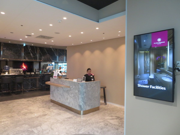 シャワーもあると書いてあるプレミアムラウンジ入り口受付が上階にあった、朝5時開店だから開店直後。 The entrance reception of the premium lounge, Information says that there is also a shower, was on the upper floor, and it opened at 5 am, so it was just after the store opened. |