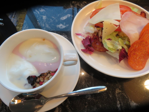 私はグラノラにヨーグルトを掛けた左のカップ、右はトマト野菜とハムサラミチーズ類。 Left cup with yogurt on granola, right with tomato vegetables and ham salami cheese |