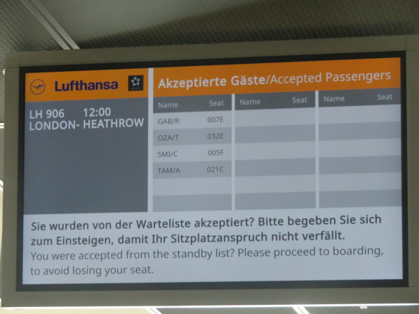 let's check that the boarding gate may change. When I asked at the counter, staff told me, "Every flight going London has a lot of vacant seats, so they managed the small size aircraft all flight last night, so there are 30 passengers can't get on. You can't get on too any of the flights today." I can not find solution even if I complain, Check the internet then I get information that Munich and Frankfurt from lot of European airports, this two airport has many of flight to London, it depends on the number of flights, so I got a ticket to Frankfurt with a flight to London and ran to the boarding gate |