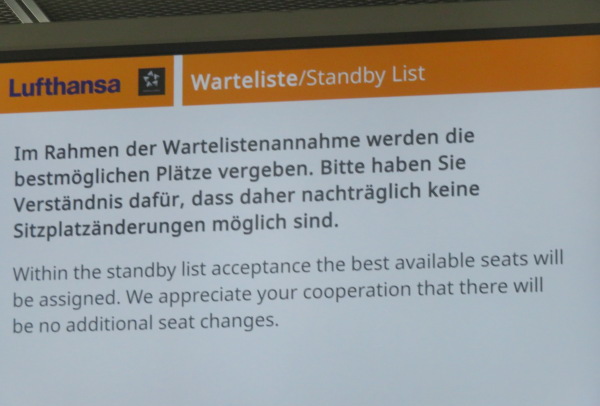 LH906は搭乗口B24まで行けと席番号のない搭乗券を発行してくれて電光掲示に追加でこれらを受け付けると名前が出てきたのでホッとしたところ。 LH906 issued a boarding pass without a seat number to go to boarding gate B24, and when I accepted these in addition to the electric bulletin board, the name came out, so I was relieved. |