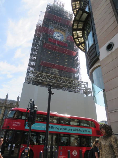 ウェストミンスター駅,地上に出たら目の前がビッグベン、時計は四方に四つあるはずだが工事中はこの駅に面した時計だけが見える。 Westminster station, Big Ben in front when I go out to the ground, there should be four clocks on all sides, but during construction we can see the clock only facing this station. |