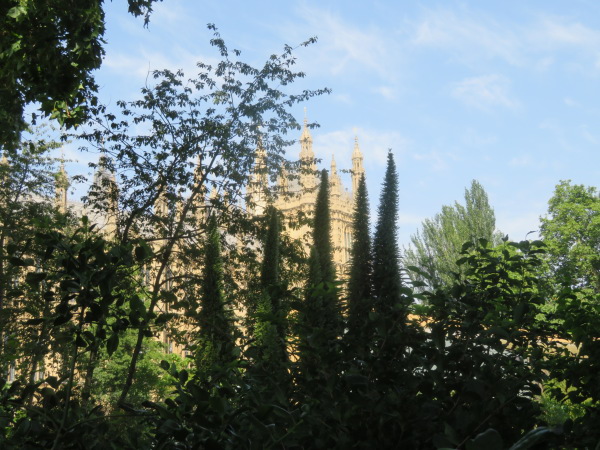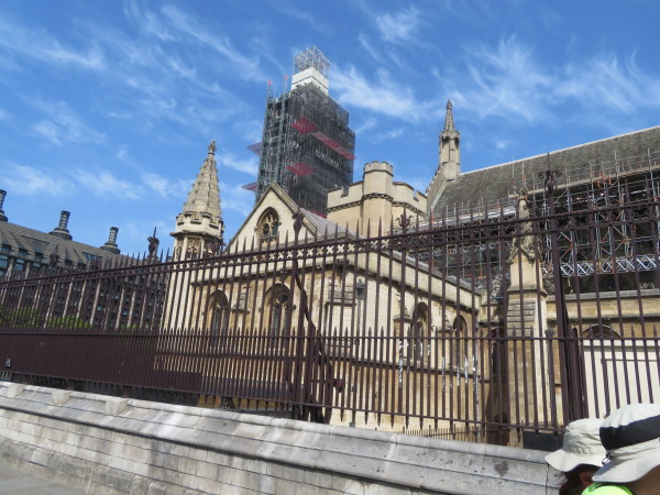 歩いてビッグベンの後ろに来た、確かビッグベンのどちらの面にも時計があったはずだが、工事中だから地下鉄駅側しか時計は見えるようにしてないようだ。 I walked behind Big Ben, and I'm sure there were clocks on both sides of Big Ben, but it seems that only the subway station side can see the clock because it is under construction. |