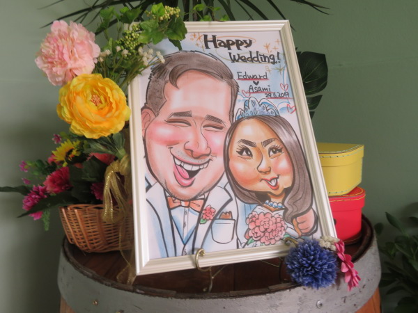 こういう新郎新婦の特徴を捉えた絵を描いてくれる処がある。 There is a place that draws a picture that captures the characteristics of the bride and groom. |